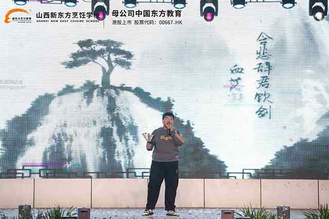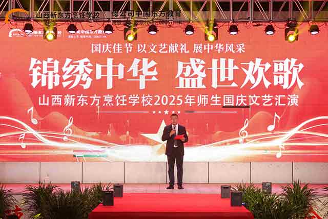 在全场期待的目光中,山西新东方烹饪学校校长于晓曦走上舞台,宣布文艺晚会正式开始。致辞中,于校长深情回顾了学校在技能人才培养道路上的初心坚守与丰硕成果,从烹饪技艺的薪火相传到现代职教理念的创新实践,每一步都凝聚着对“培养高素质技能人才”的执着追求。她寄语全体师生,要以双节为契机,既要深耕专业领域、锤炼过硬技能,更要传承中华优秀传统文化,将个人成长与祖国发展紧密相连,让青春在为国家贡献、为行业赋能中绽放光彩。温暖而庄重的话语,为整场晚会奠定了家国同心的情感基调。